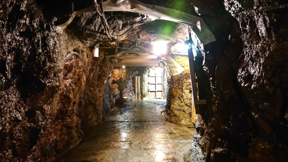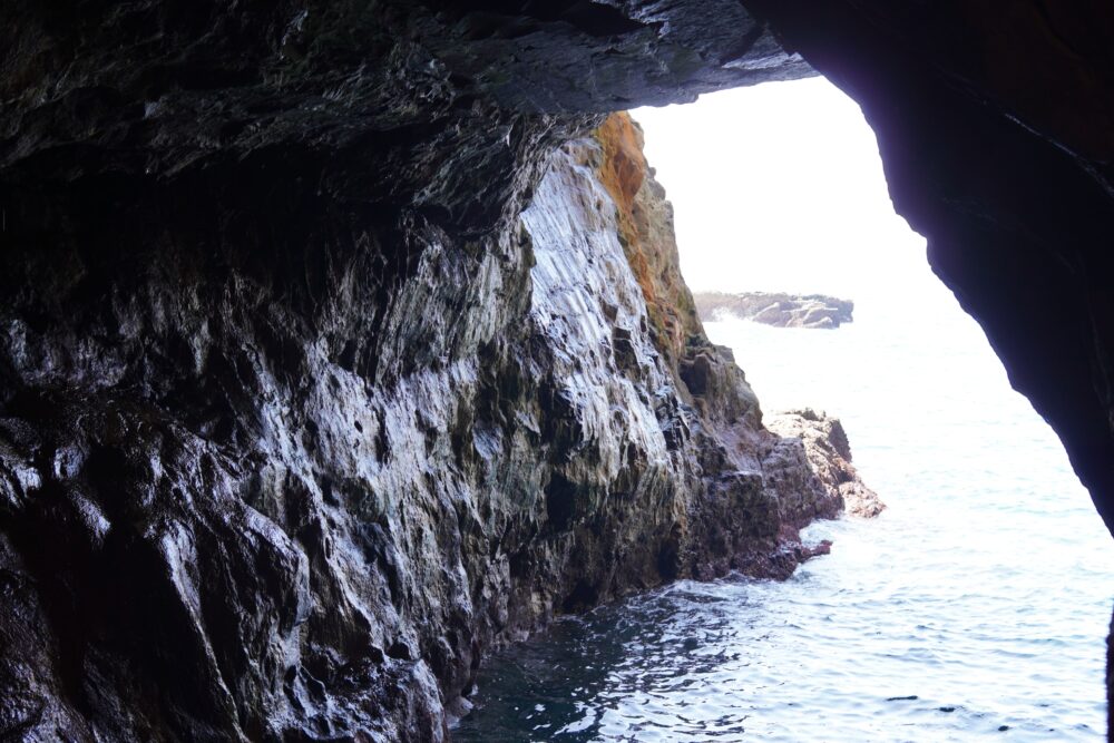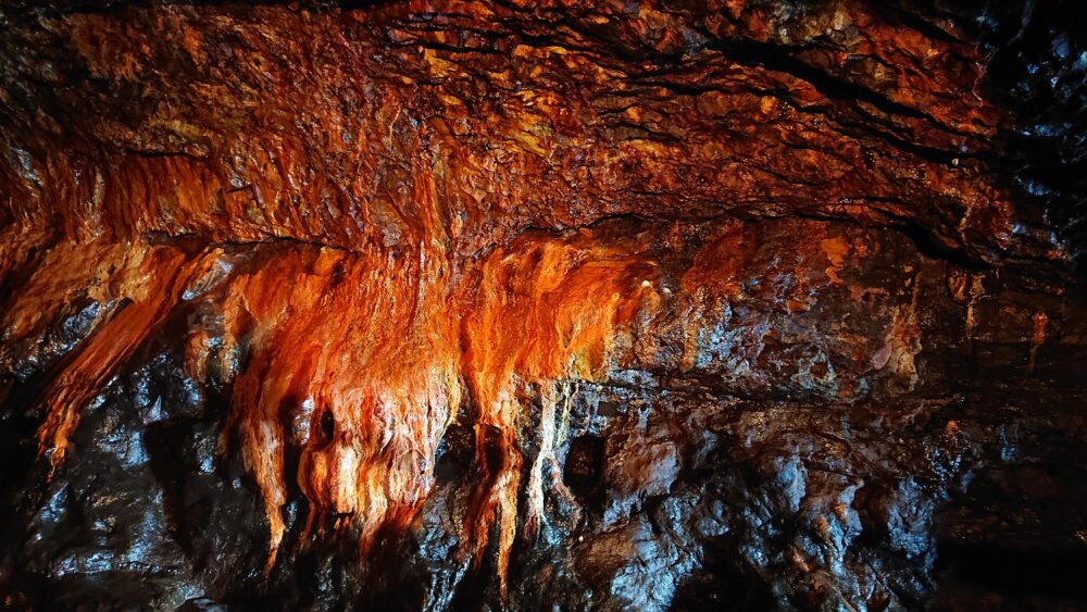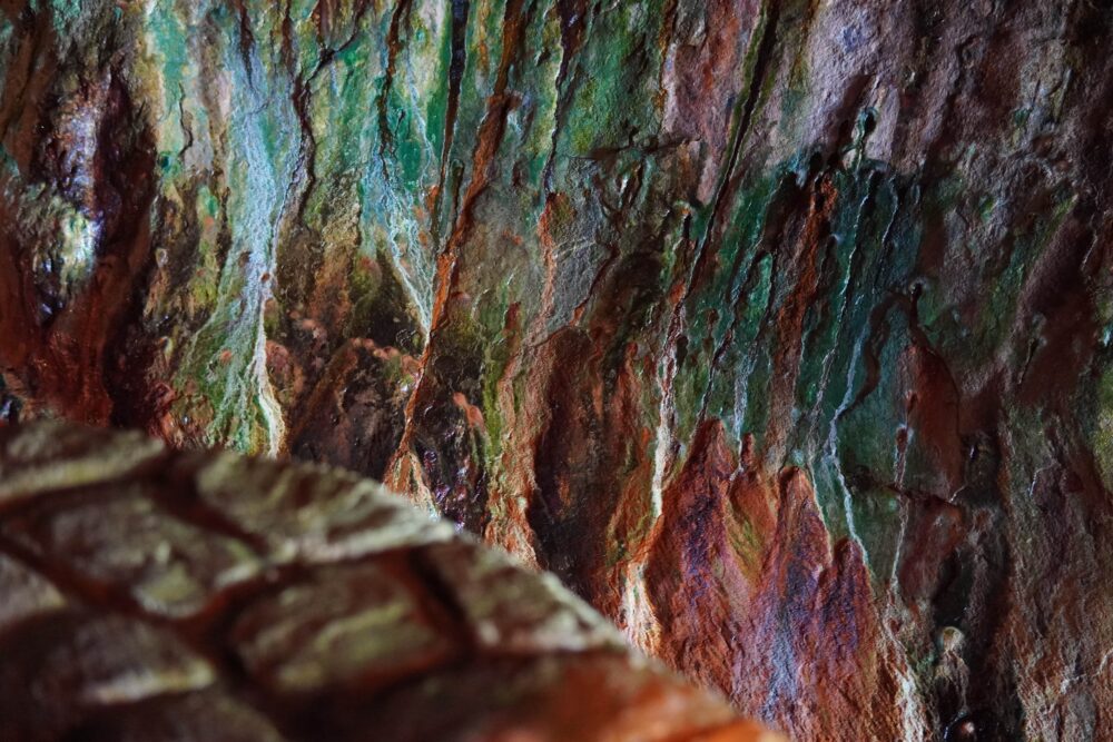 洞窟内は、超人ハルクを思わせる緑色の岩肌や